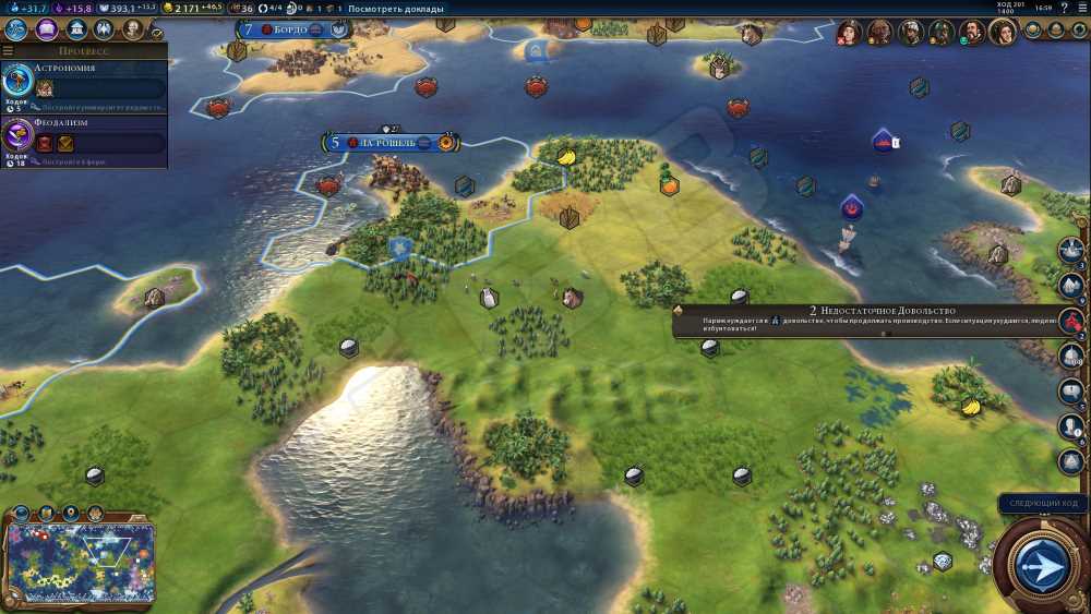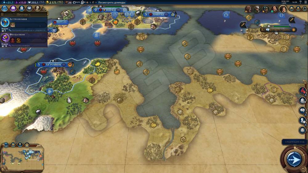 Изначально в игре, не изученный мир закрыт, а посещенные места покрываются туманом войны. С одной стороны это удобно, ибо меньшая нагрузка на систему создается, меньше анимации показывается на экране. С другой стороны, всегда существует любопытство, а что там, где я еще не был. Не важно, случайно генерируемая у вас карта или спланированная вами, но в начале игры бывает интересно, кто где поселился или где находятся города-государства, и многое иное.