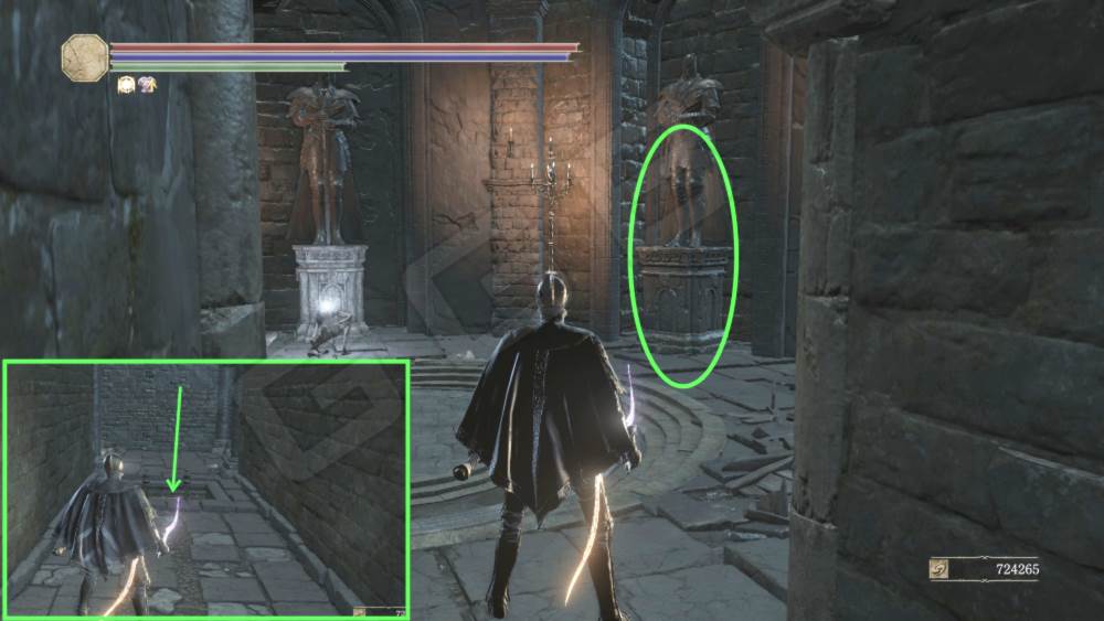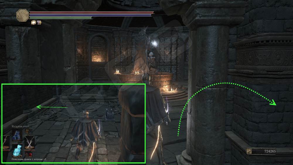Теперь от костра Мидира вы можете снова перенестись к Внутренней стене города, спуститься полностью до конца на лифте вниз и вернуться к памятнику Гвину. Слева от него есть ворота. Выходите и напротив Церкви увидите Монолит божественного копья.