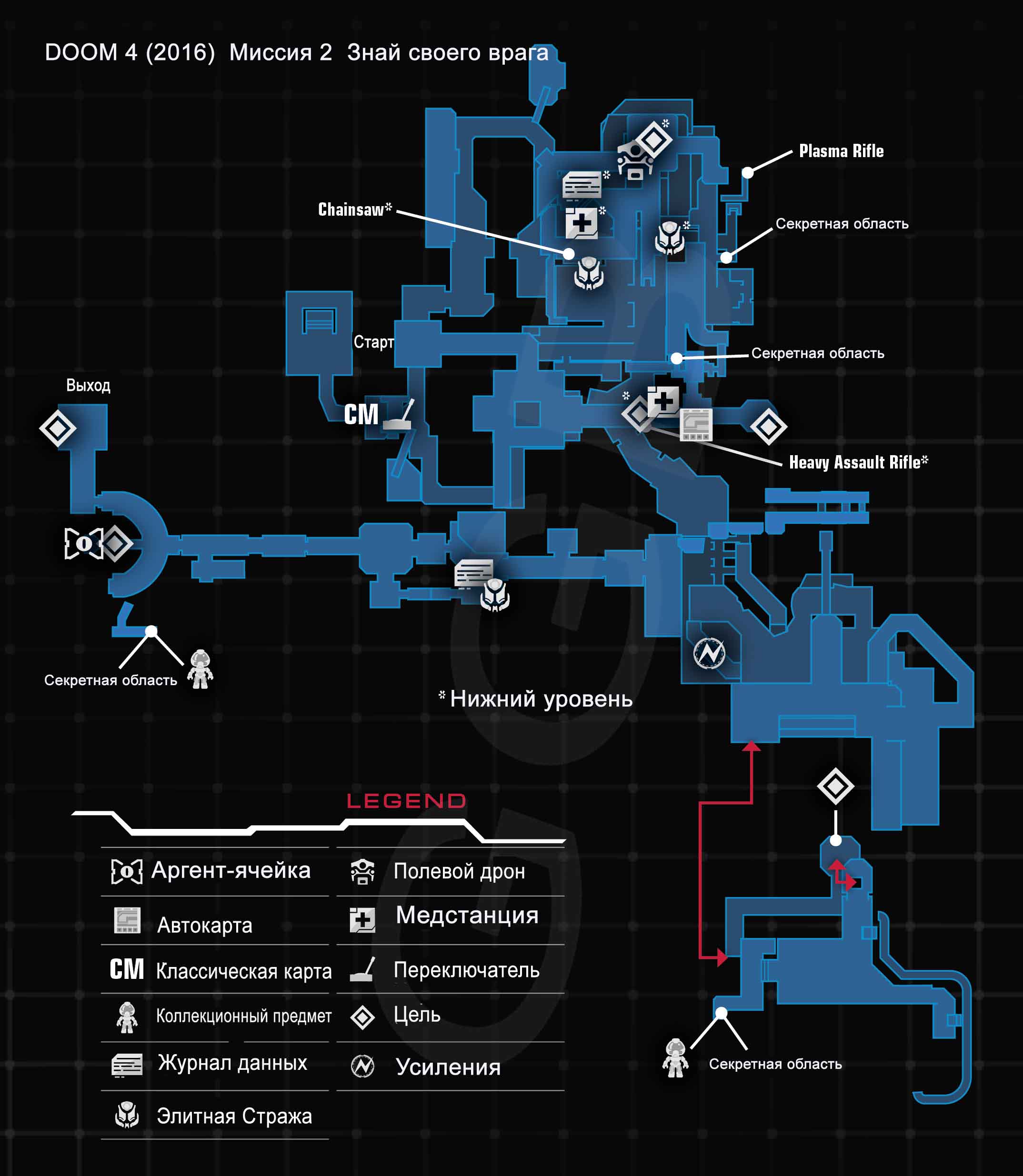Миссия Знай своего врага является второй по счету в новой DOOM. Она гораздо больше перового задания и более насыщенная в плане объектов. Ниже мы представляет полную карту с отметками расположения секретных областей, классической карты, местонахождения оружия и коллекционных предметов. Также на карте присутствуют и пути перехода между частями уровня.