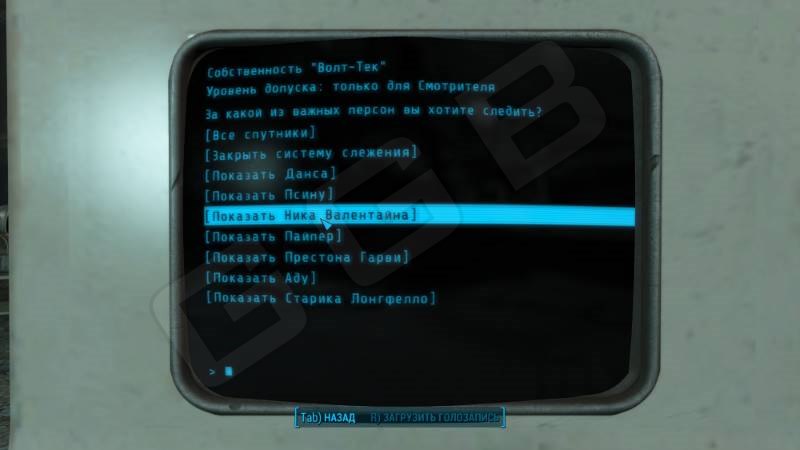 - Слежка за VIP-персонами (вашими спутниками, например, Ник Валентайн, Паладин Данс, Пес, Кьюри, Пайпер и пр.)