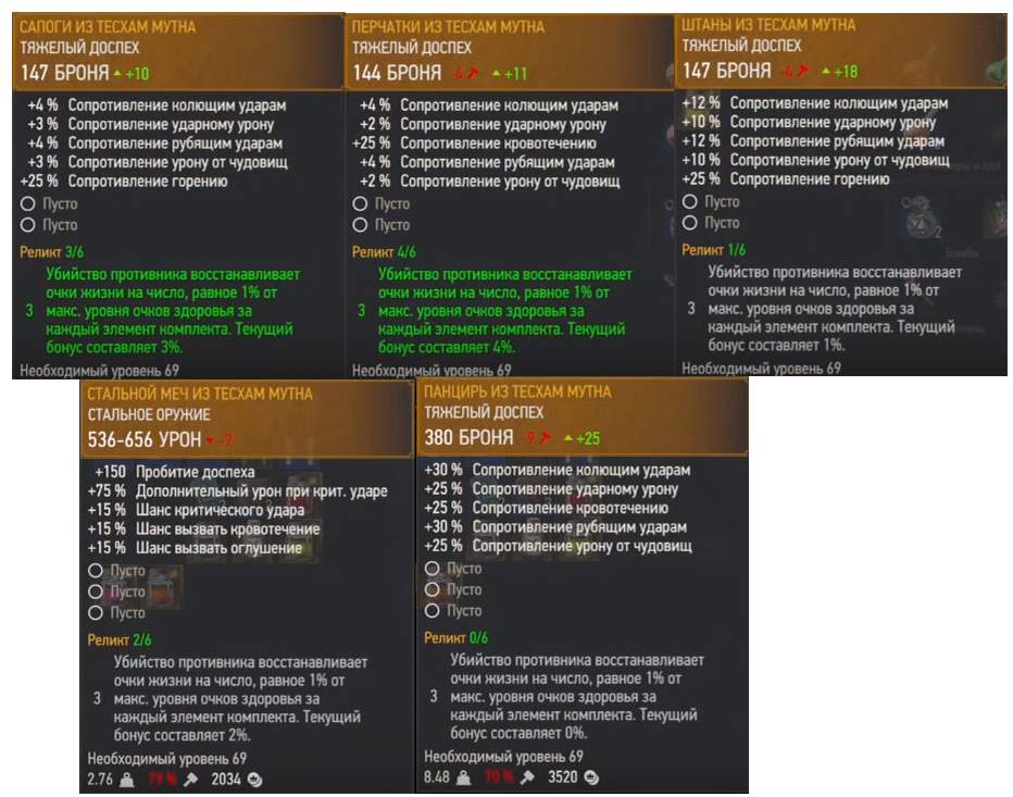 Сет брони из Тесхам Мутна совершенно новый наряд для Геральта в дополнении «Кровь и вино» в Ведьмак 3. Это тяжелая броня и рассчитана она на 39 уровень (при NG+ 69 уровень). При надевании трех предметов сета, вы получаете навык Вампиризм, что восстанавливает здоровье Героя при убийстве мобов. Ниже в руководстве мы подробно рассмотрим где найти такой доспех.