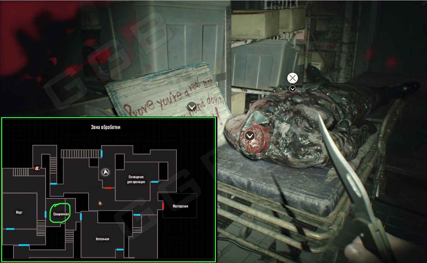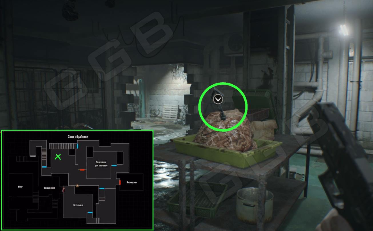 После убийства Маргариты отправляйтесь в подвал главного дома, в зону Обработки, через Котельную, а затем в Секционную. По пути вас будут атаковать твари, будьте осторожны. Здесь вы обнаружите труп полицейского и записку с предложение «сунуть руку в глотку». Вот именно и сделайте, суньте руку и достаньте ключ со змеей.