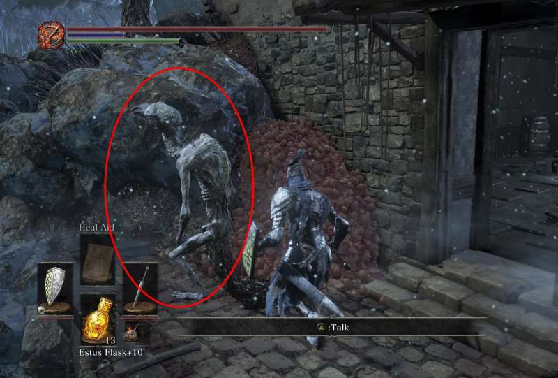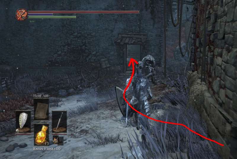 После босса отправляйтесь к костру Поселение воронов. Выходите из здания и сверните направо. Здесь будет здание, в котором в первый раз вы встретили дружелюбного Ворона. Теперь он будет находиться на террасе. Пообщайтесь с ним и в награду получите кусок титанита.