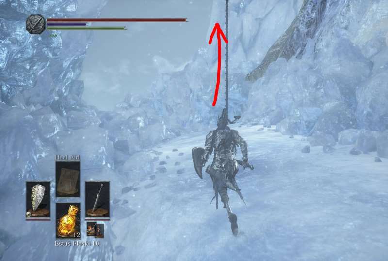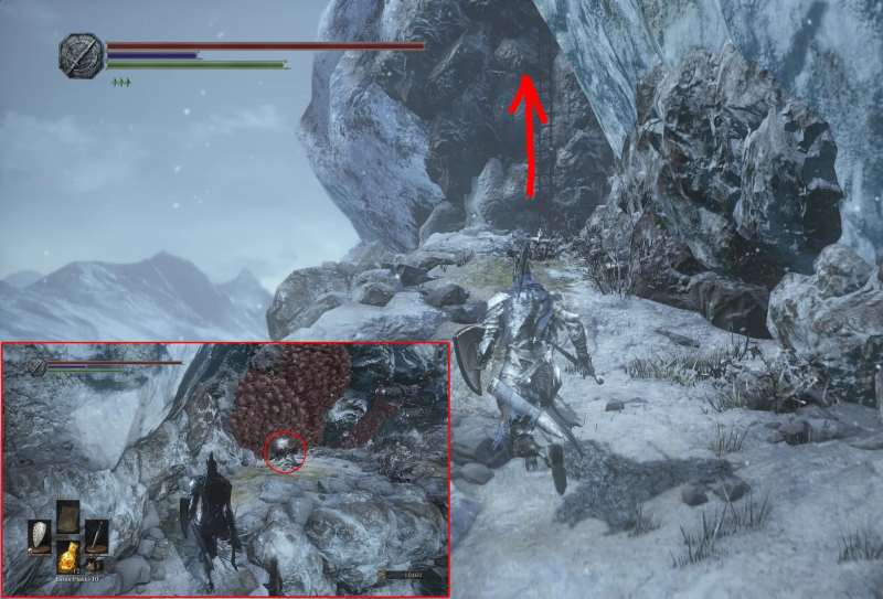Нужный костер именуется как Недра картины. Это секретная область под Часовней Арианделя. От костра двигайтесь налево и по правой стороне увидите небольшою тропку вверх. В конце возвышения найдите огромную лестницу, что ведет до замороженного уступа близ вершины скалы. Поднимитесь на уступ, потом на тот, что меньше. В результате вы обнаружите труп у скалы, на трупе будет кусок титанита.