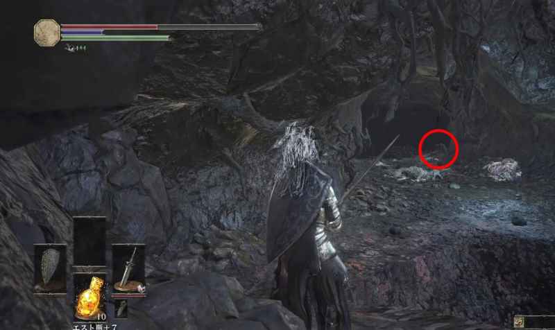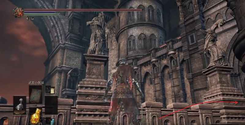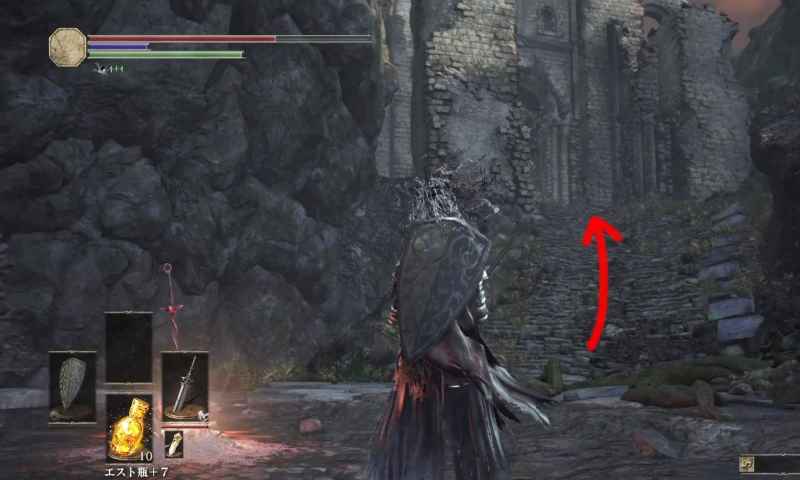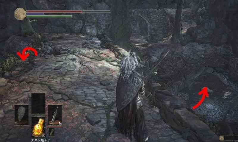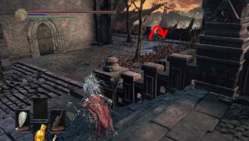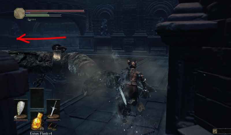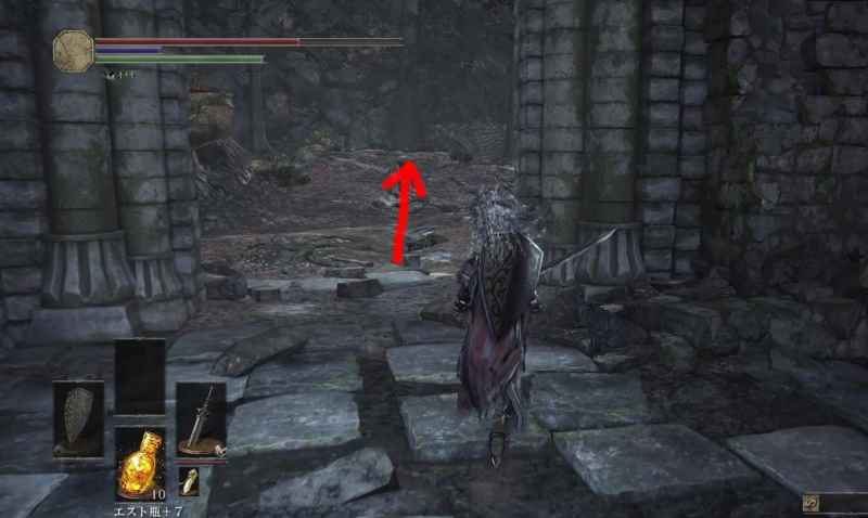 Пройдя арку и спустившись по лестнице, сворачивайте направо, где в стене есть небольшой пролом и спрыгивайте вниз. Здесь также будет Белый дракон, если вы посещаете это место впервые.