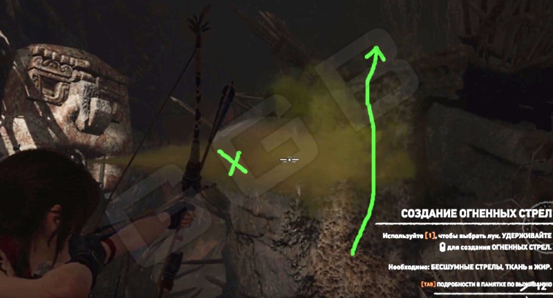 Прыгайте в яму и снова двигайтесь вперед и вниз, пока не достигните первой преграды в виде головы, что будет выдыхать газовую струю. Огненными стрелами уничтожьте ее, и откроется проход по скале вверх. При возжигании газа взрыв получается достаточно большой – стойте подальше, но и проходите быстро, после выстрела. Материалы для огненных стрел будут встречаться на всем пути исследования.