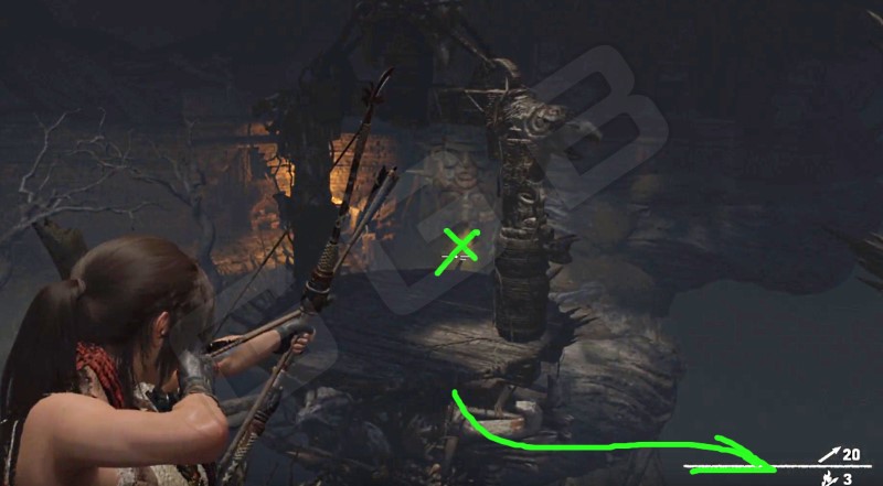 От лагеря двигайтесь внутрь руин башни, пока не увидите слева заваленный проход. С помощью стрелы сломайте преграду, прыгайте на стену, спускайтесь вниз и двигайтесь вперед. Рано или поздно вы увидите еще одни лагерь Горные катакомбы и яму.