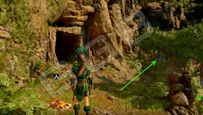 Для выхода, сразу же от стелы сверните налево, пройдите по туннелю и спускайтесь по веревке. Вы окажитесь в водоеме, там же, где на правом берегу есть и костер.