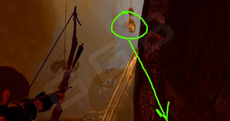 Здесь снова будут враги, но походу дела поднимайтесь наверх строения. Слева будет еще один механизм, что нужно привести в действие. Уровень воды опять поднимется, и вы увидите совсем рядом свой плот. Бегите направо по суше и плот немного к вам приплывет. С помощью стрелы и веревки подтяните его к себе. Соедините его с осью колеса. Запрыгивайте и плывите.