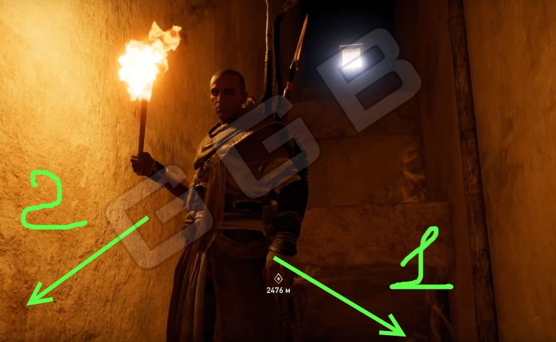 Вход в гробницу расположен на северной стороне пирамиды Хафры и на юго-западе от самой большой пирамиды. Спускайтесь очень и очень глубоко, пока путь не разветвиться вперед и назад. Это сразу после ступенек. Идите вперед и в небольшой камере заберите первый кварц. Возвратитесь и спускайтесь еще глубже в могилу.