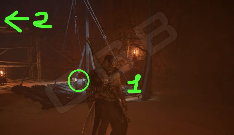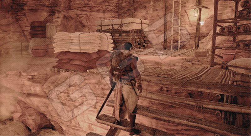 Внутри пещеры на первой открытой площади будет несколько бандитов. Их можно выманить в проход. Затем, оказавшись в зале, в дальнем правом углу увидите много лестниц и тюков. Здесь будет кварц(1). На другом конце зала на вершине платформы найдется еще один кварц (2).