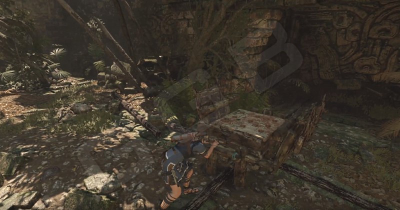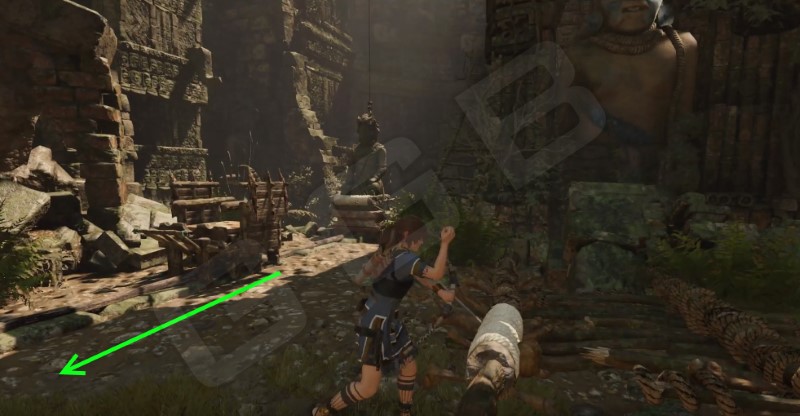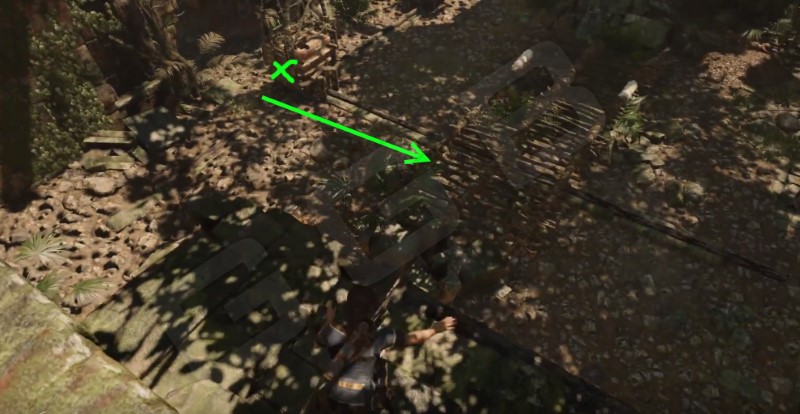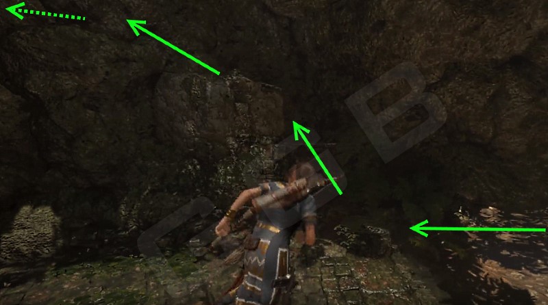 Из лагеря Обломки самолета по правой стороне (если костер перед Ларой, а навес у нее за спиной) двигайтесь до того, как справа увидите уступ, окрашенный желтым черепом. Залезайте, пройдите озеро и сделайте трещину в скале. Прыгать на противоположную сторону не обязательно, внизу водоем, поэтому можно и просто спрыгнуть.