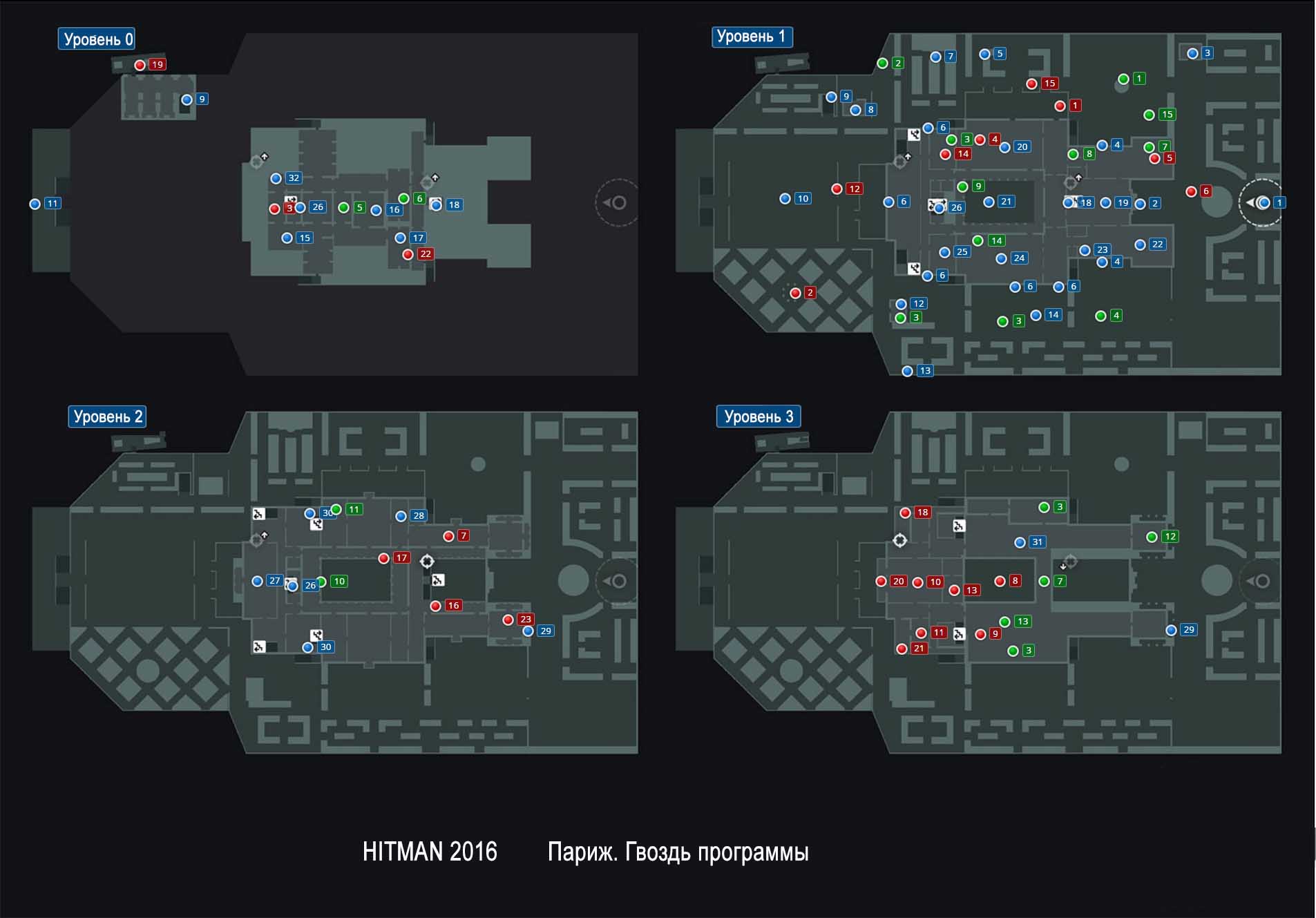 Полная карта миссии и всех уровней дворца в Париже, расположения НПС, предметов в первом эпизоде Hitman 2016 — Парижский показ Сэнгвин. Гвоздь программы. Все этажи дворца, прилегающие территории, пути отступления, идеи для устранения и саботажа, ключевые точки, персонажи, прилегающие территории и прочее.