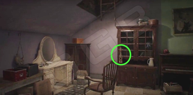 - Детская комната. Одежду девушке не отдавайте. Как войдете, справа вдоль стены у пианино будет находиться шкафчик. Прикрепите найденную деталь на Лампе, что будет в шкафу, нажмите кнопку на оном светильнике и появится лестница. Она ведет на чердак.