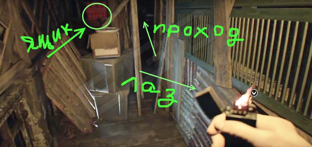 - Вылезайте через окно и, будучи на веранде, поверните направо. Идите до конца. Вы увидите красный ящик. Справа будет небольшой прикрытый лаз. Отогните лист металла внизу, а затем обратите внимание на сам ящик. Используйте небольшой проход между завалами. Пройдите, откройте ящик и заберите Собачью голову.