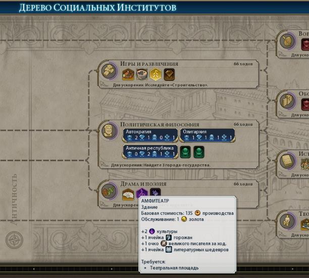 Театральная площадь – основа для достижения культурной победы. Здесь будут появляться Великие писатели, художники, музыканты, поэтому стройте её как можно раньше и изучайте соответствующие технологии. Чудеса света, размещенные близ театральной площади, увеличат очки культуры, а также и клетки рядом +2 очка.