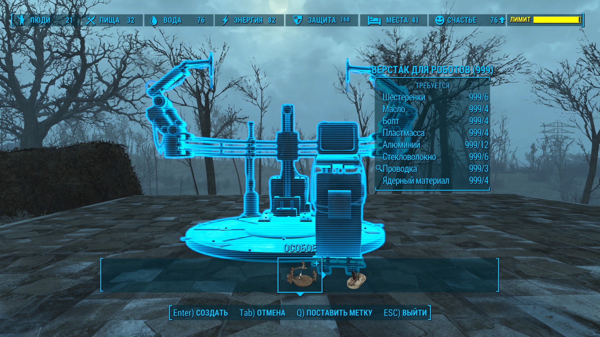 Создать робота можно только на верстаке, доступ к которому открывается после прохождения первого задания DLC Automatron. Вы можете построить его из меню Строительство – Особые (там же где пушка, полученная от Минитменов) в любом поселении. На данной рабочей станции можно также и улучшать роботов.