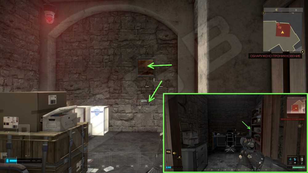 Напротив входа в банк существует вход в Гараж банка. Охраны будет много, но вам нужно проникнуть внутрь. Уже внутри обратите внимание на вентиляционную решетку слева от входа. Здесь также будет вентилятор находиться. Используйте как раз таки «удаленный взлом» и выключите оный вентилятор. Таким нехитрым образом вы сможете попасть в вентиляционную шахту.