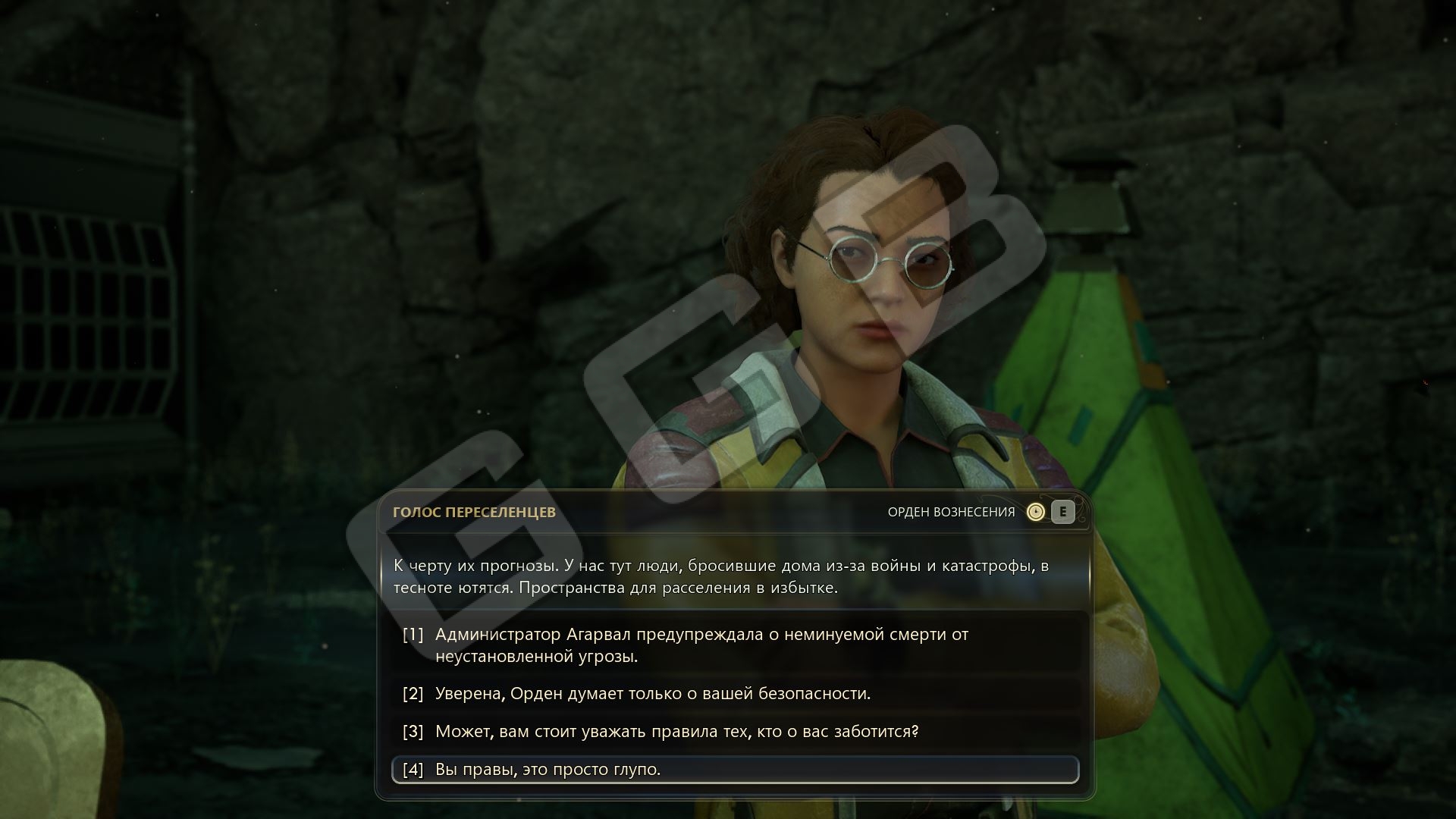 После того как вы собрали доказательства с обеих сторон, изучая Милость Матриарха, вы встретитесь с Голосом Переселенцев и Администратором Агарвалом из Ордена. Голос утверждает, что её народ заслуживает пространства для расширения в Зону Отчуждения — ограниченную зону. Агарвал бормочет, что их модели показывают, что зона небезопасна — они предсказывают смертельный оползень, как в прогнозе погоды, если кто-то туда двинется. Обе стороны хотят, чтобы вы, посторонний, были решающим голосом. Потому что, конечно, они это делают.
