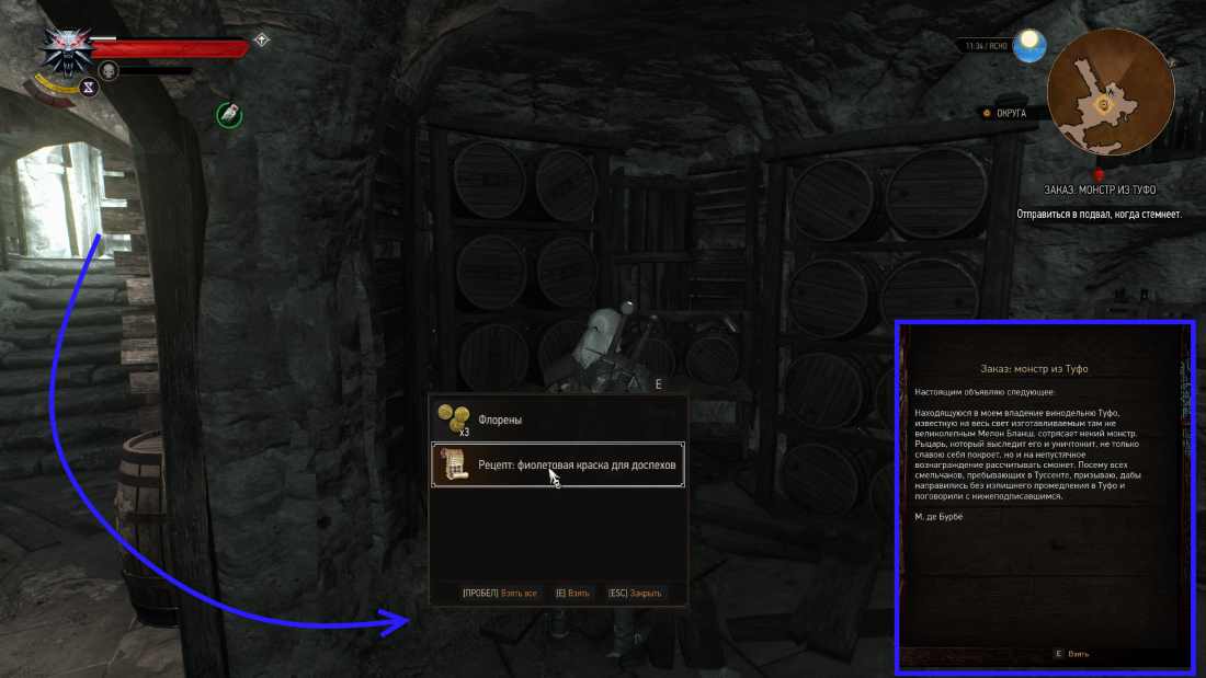 Этот рецепт доступен только во время дополнительного задания. На доске объявлений в Деревне Фловив найдите заказ: монстр из Туфо. Следуйте указателю и идите на северо-восток на винодельню, что буквально в нескольких шагах, и пообщайтесь с заказчиком. Он даст вам ключ от подвала и скажет приходить ночью. Но можно зайти в подвал в любое время суток. Как войдете, спускайтесь по лестнице и сверните налево. Среди полок с бочками, на полу в сундуке и найдется рецепт. Без квеста получить ключ от подвала нельзя, а без ключа нельзя и войти.