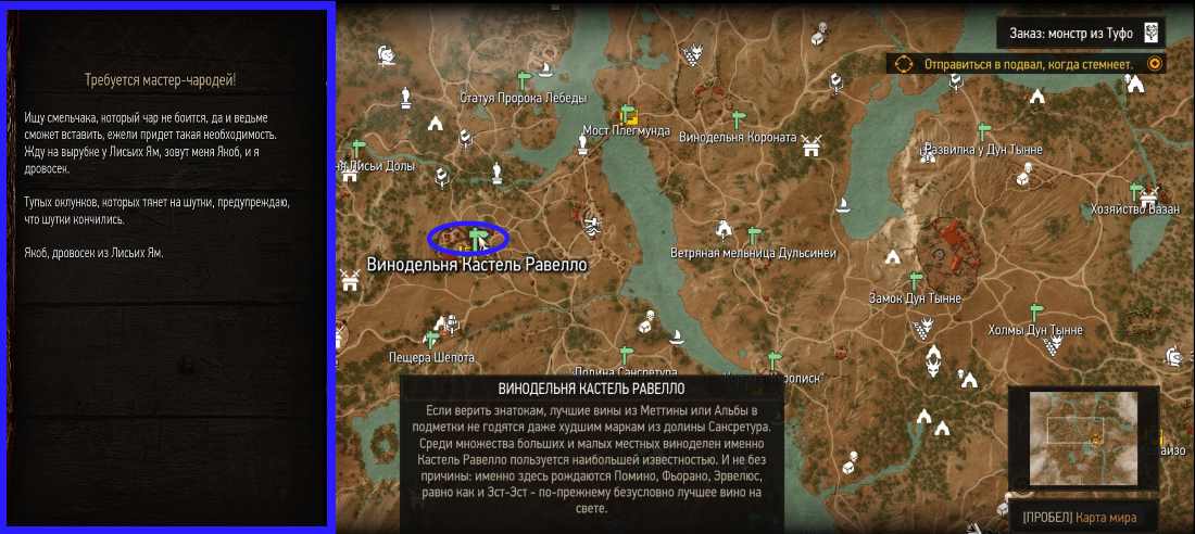 Винодельня Кастель Равелло. Здесь также потребуется найти доску объявлений и сообщение: Требуется мастер-чародей! Оно откроет доступ к заданию «О рыцаре и прекрасной даме». В ходе данного квеста Геральту предстоит осмотреть хижину на скале. На столике напротив входа и найдется рецепт.