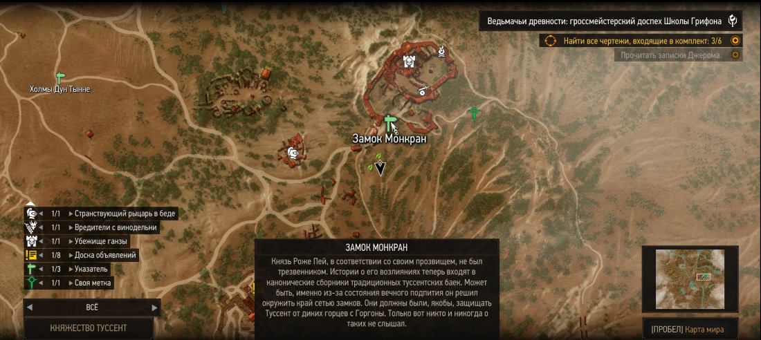 Снова Замок Монкран, но теперь предстоит отправиться наверх башни. Как войдете в замок поверните налево, чуть пройдите и поднимитесь по лестнице справа. На полянке повернитесь налево и увидите башню. Заходите внутрь нее. Здесь много лестниц и ваша задача подняться на самый-самый верх. Наверху под тентом обнаружится столик и на нем сундучок с рецептом краски.