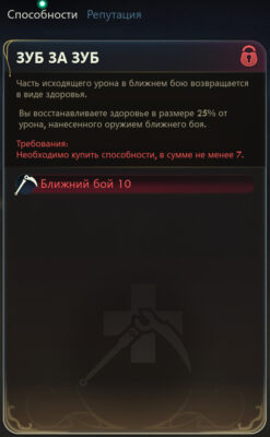 - Зуб за зуб: Восстанавливает здоровье в объеме 25% от урона, нанесенного оружием ближнего боя.