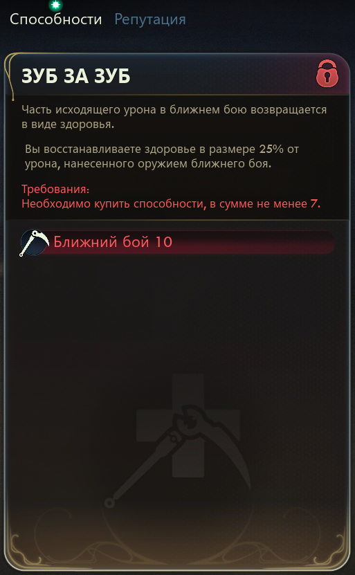 - Зуб за зуб: Восстанавливает здоровье в объеме 25% от урона, нанесенного оружием ближнего боя.