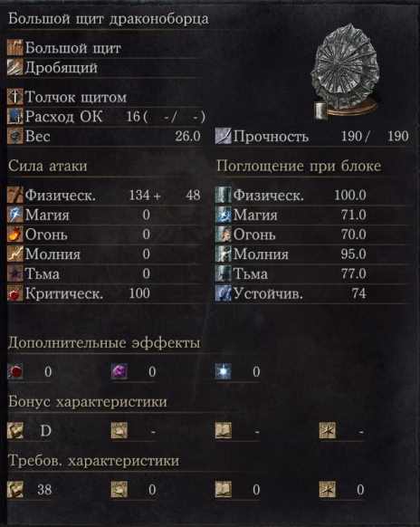 Огромный круглый щит с навыком Толчок щитом. Не ослабляя блока, ударьте врага щитом, чтобы откинуть его или ошеломить. Работает независимо от того, в какой руке щит.