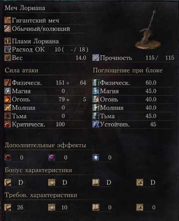 Огромный двуручный меч с навыком Пламя Лориана. Выпад заставляет раскаленный меч вспыхнуть, а сильная атака выпускает из него струю пламени.