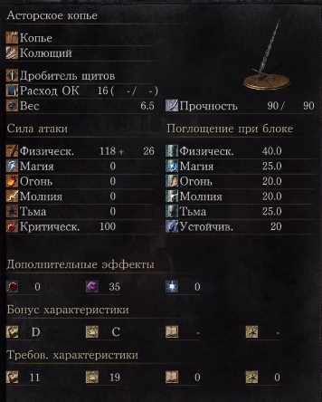 Асторское копье (Arstor’s Spear)Копье с навыком Дробитель щитов. Сделайте большой шаг вперед и атакуйте прицельным выпадом, чтобы пробить вражеский щит и нанести урон. Более того, оно также восстанавливает 30 единиц здоровья Героя после смерти противника. Требуется для использования: Ловкость – 19 Цена: 1 000 душ |