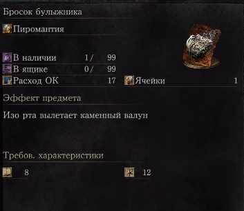 Бросок Булыжника (Boulder Heave)Заклинание класса Пиромантия, которое позволяет кидаться каменным валуном. Требуется для использования: Вера – 18 |