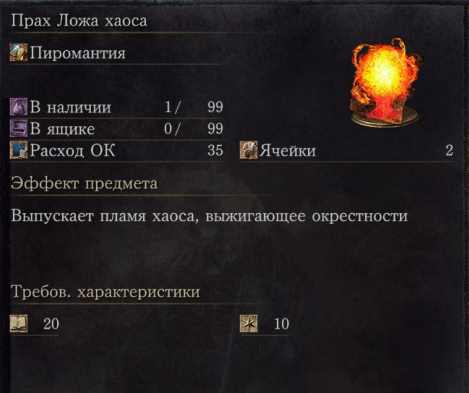 Прах Ложа хаоса (Chaos Bed Vestiges)Заклинание класса Пиромантия, что наносит АОЕ урон огнем. Требуется для использования: Вера – 10, Интеллект – 20 Цена: 20 000 душ |