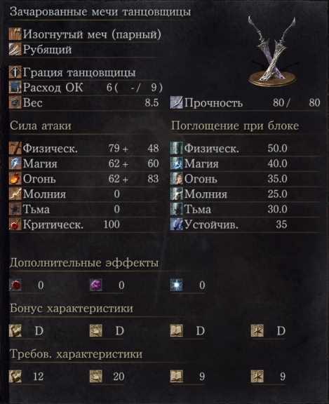 Зачарованные мечи танцовщицы (Dancer’s Enchanted Swords)Парные клинки, что немного светятся от зачарования и обладающие навыком Грация танцовщицы. Явите ярость обоих клинков в танцующем кружащемся движении, используя сильную атаку, чтобы продолжать движение пока запас выносливости не иссякнет. Более того, каждый клинок обладает собственным магическим уроном. Один – огнем, другой – магией. Требуется для использования: Вера – 9, Ловкость – 20, Сила – 12, Интеллект – 9 |