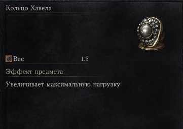 Кольцо Хавела (Havel’s Ring)Одно из известных колец, которое можно отнести даже к общему сету брони Хавела. Свойство оного кольца очень простое и нужное многим – увеличить количество переносимого веса. Цена: 5 000 душ |