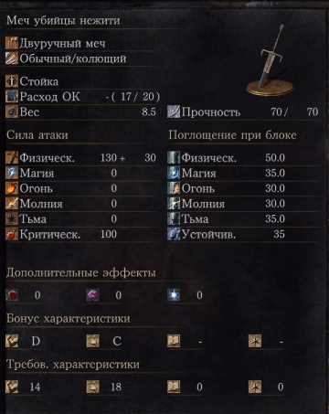 Меч убийцы нежити (Hollowslayer Greatsword)Двуручный меч с навыком Стойка. Приняв стойку, используйте обычную атаку, чтобы пробить блок снизу, или сильную атаку, чтобы провести рубящий удар снизу вверх с выпадом. Требуется для использования: Ловкость – 14, Сила -20. Цена: 1 000 душ |