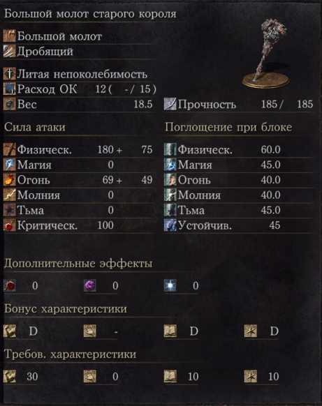 Большой молот старого Короля (Old King’s Great Hammer)Молот с навыком Литая непоколебимость. Утвердите оружие на земле, чтобы временно укрепить баланс, и используйте сильную атаку, чтобы несколько раз ударить по земле, и вызвать несколько взрывов. Требуется для использования: Вера – 10, Сила – 30 |