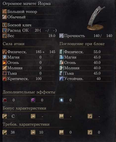 Огромное мачете Йорма (Yhorm’s Great Machete)Личное оружие Йорма, обладающее навыком Боевой клич. Издайте мощный боевой клич, который временно усилит ваши удары и позволит провести сокрушающую сильную атаку. Требуется для использования: Сила – 38 |