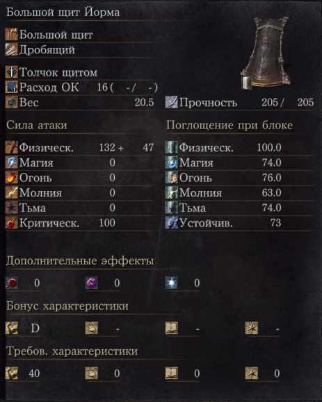 Большой щит Йорма (Yhorm’s Greatshield)Щит, обладающий несколькими интересными особенностями. С одной стороны, это навык Толчок щитом. Не ослабляя блока, ударьте врага щитом, чтобы откинуть его или ошеломить. Работает независимо от того, в какой руке щит. С другой стороны, увеличение устойчивости на 73 единицы. Требуется для использования: Сила – 40 |