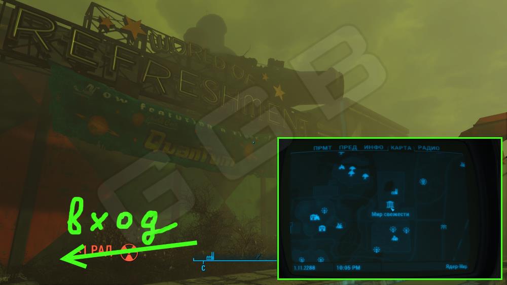 Раскраска Ядер или Nuka Cola Ядер находится в районе парка «Мир свежести». Как появитесь в зоне, идите по речке вперед до тех пор, пока не увидите справа набор Силовой брони в клетке. Чуть дальше клетки по правой стороне в стене будет дыра. Пройдите внутрь, поднимитесь по лестнице, отключите терминал в дальнем левом углу комнаты и можно забрать броню из клетки.