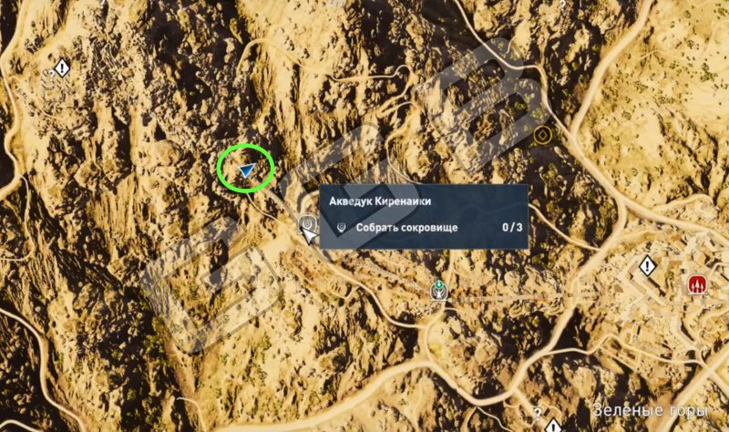 Центральная часть Зеленых гор, акведук Киренаики. По акведуку следуйте на северо-запад в горы и прыгайте в бассейн с водой. И чуть впереди, под водой, в нише с парой кувшинов найдется сокровище.