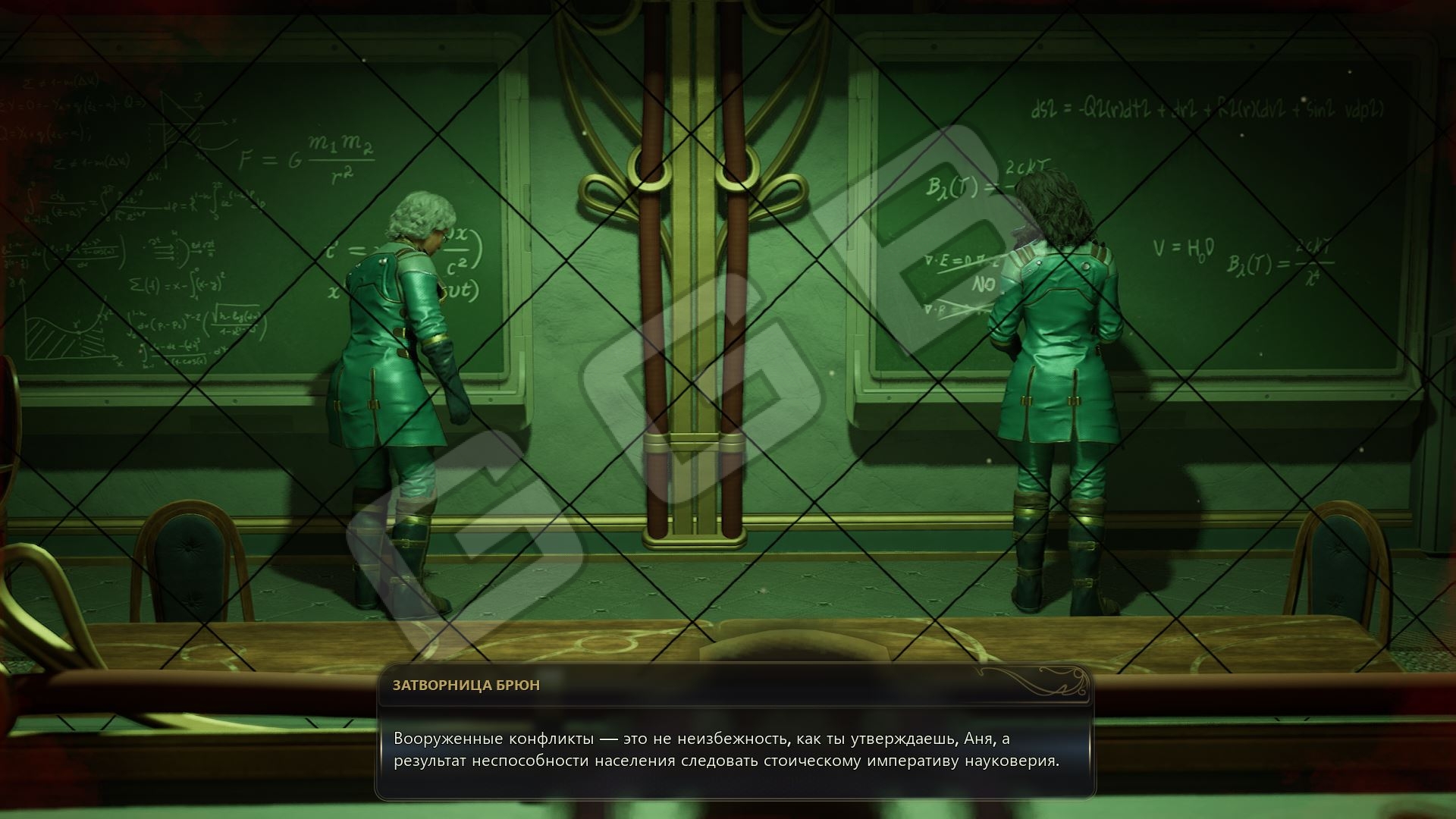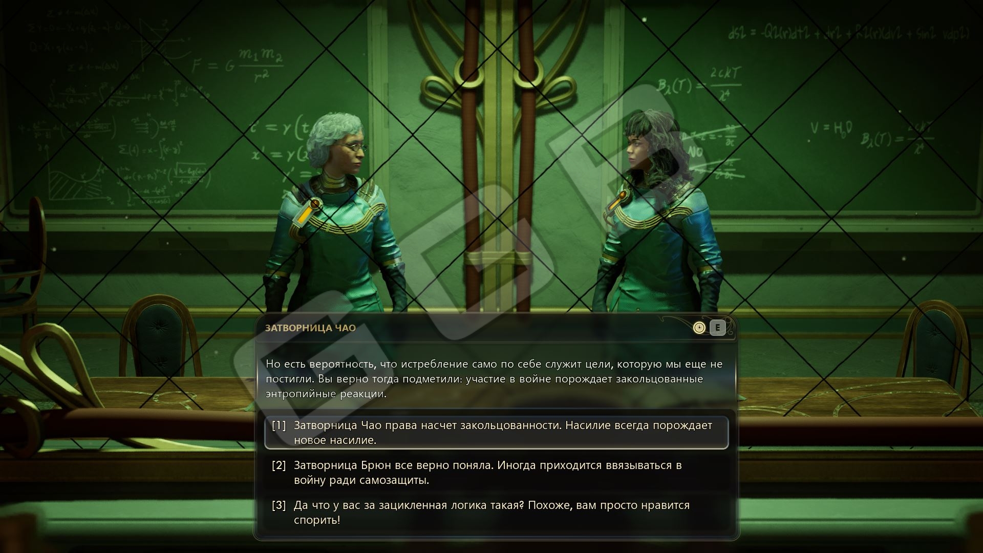 Внутри комнаты вы встретите двух учёных, Брюн и Чао, которые бесконечно спорят. Они, кажется, слишком поглощены своими математическими уравнениями, как видно на досках и философских дебатах, чтобы заметить хаос снаружи. Говорите с ними через микрофон в комнате. Они оба уверены в своей военной логике, подкреплённой определённым академическим учебником, хотя книги отсутствуют. Как вы и ожидали, вас попросят вернуть эти книги:
