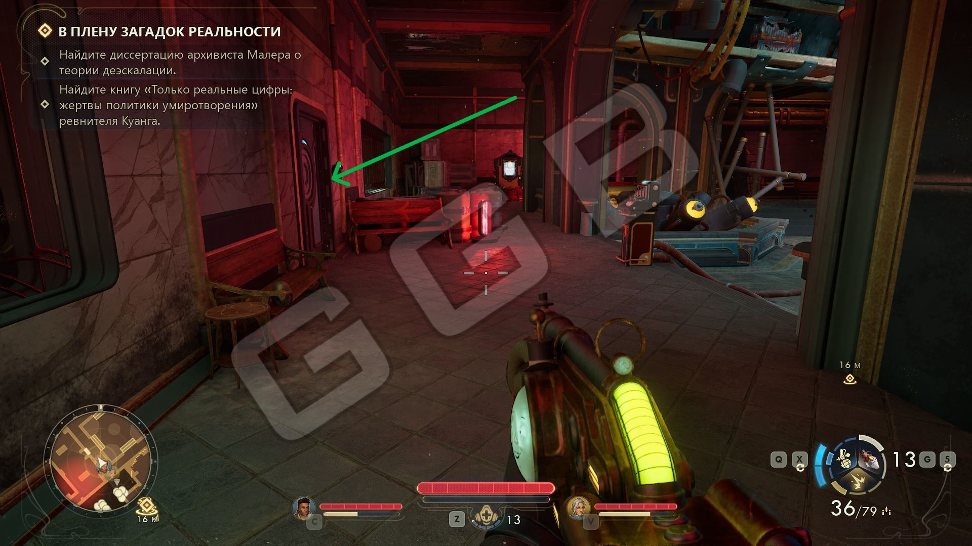 Вам нужно добраться до места, где содержатся заложники, и вы столкнётесь с двумя подписанными дверями: «Be a Hero» справа и «Betray Your Values» слева. Искомая книга «Только реальные цифры: жертвы политики умиротворения» находится в «Be a Hero».