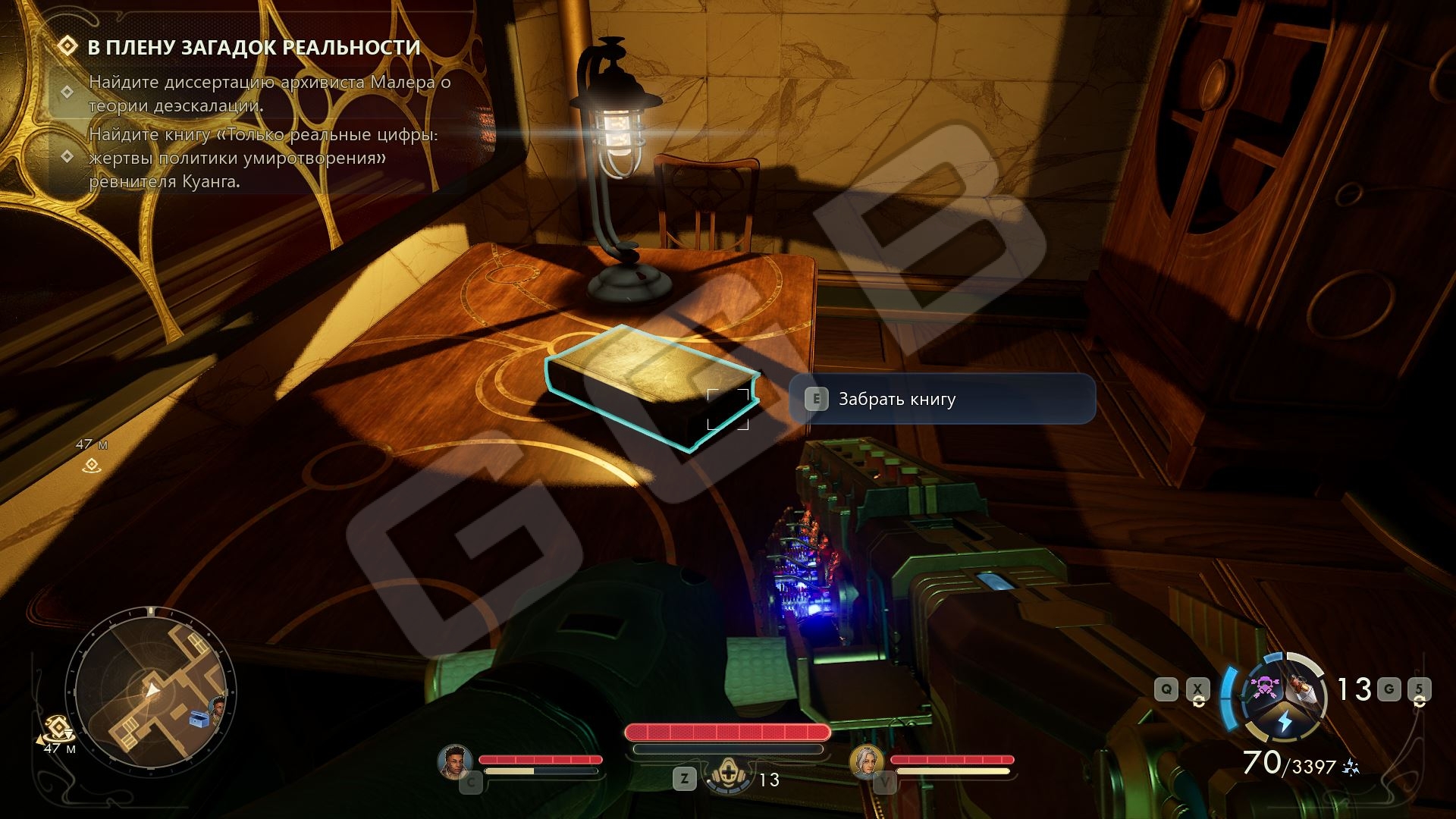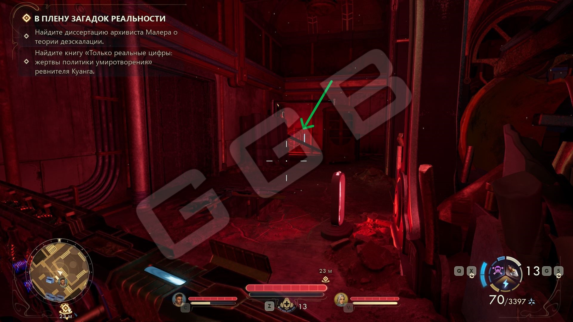 В комнате «Betray Your Values» поднимайтесь наверх на верхний этаж, и вы попадёте в тусклый скрипторий с деревянной мебелью. Посмотрите налево — по доскам, ящикам у стены с жёлтыми тканями можно взобраться, чтобы попасть в галерею выше. Напротив выступа есть ещё одна небольшая платформа. Перепрыгните и двигайтесь к левому углу верхнего этажа, где на столе лежит вторая книга — «Теория конфликта и деэскалации».