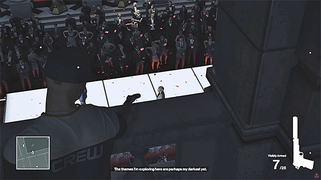 Теперь нам нужен второй этаж. Спускаемся и с балкона смотрим на подиум, где появляется Виктор Новиков. Он начнет речь и ваша задача успеть всё сделать до её завершения. Стреляем из пистолета с глушителем и уходим из локации.
