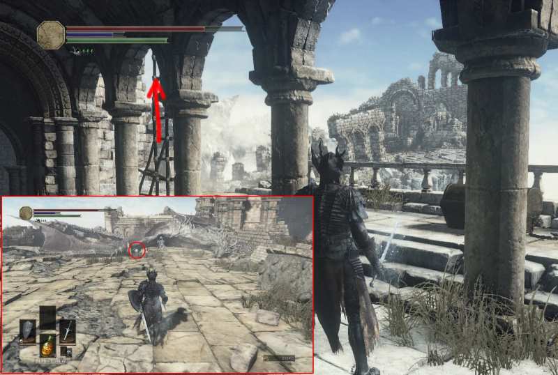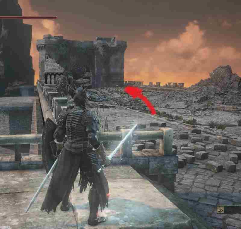Отправляйтесь в Путь жертв в костру Старый волк Фаррона. Близ волка справа находится лифт. Поднимайтесь на нем и держите путь по мосту налево.