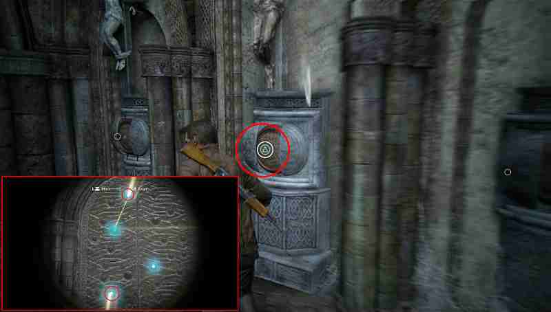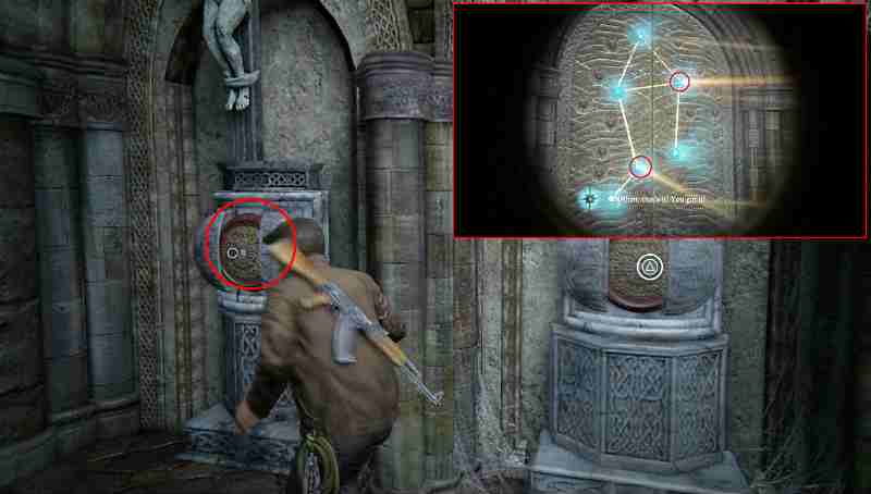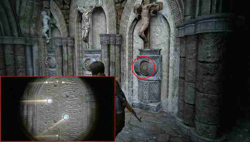 Когда вы доберетесь до склепа Генри Эвери, вам предстоит использовать свет в сосудах и выложить определённое изображение. Следуйте вдоль распятий и используйте сосуды, что находятся под ними. Осмотрите их и увидите, как световые пучки будут отображаться на задней стене. По сути, вам потребуется выложить знак зодиака Весы.