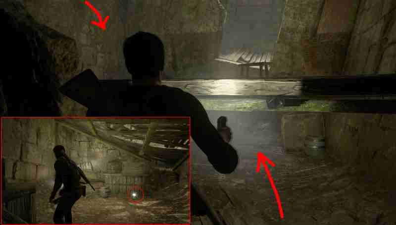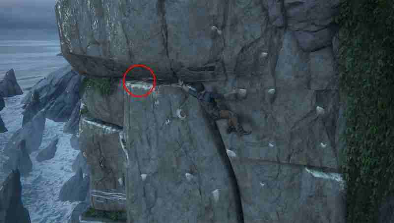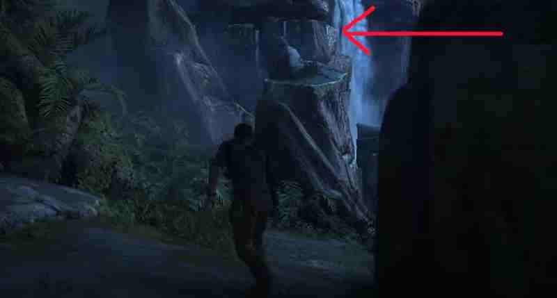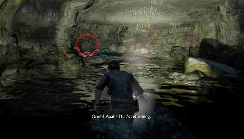 В самом начале главы из пещеры, где найдете фонарик, двигайтесь налево и поднимайтесь по скале у водопада. Сокровище будет в нише скалы близ уступов. Вы можете либо забраться и затем чуть спуститься, или прихватить его сразу.