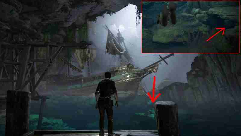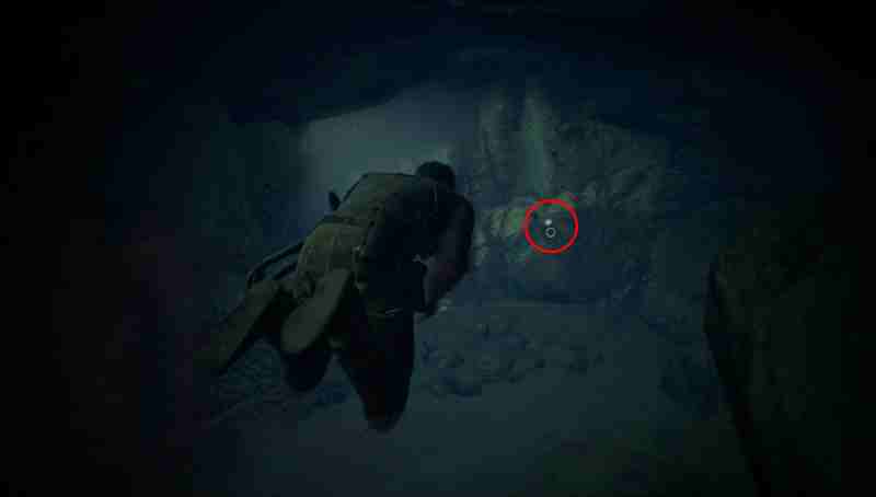 В начале главы вы будете находиться на деревянном пирсе, а разбитый корабль будет перед вами. Прыгайте вводу и плывите к скалам, что справа от вас. Нырните и найдите вход в подводную пещеру, что также будет справа. Проплывите внутри и на камнях среди водорослей и обнаружится искомое.