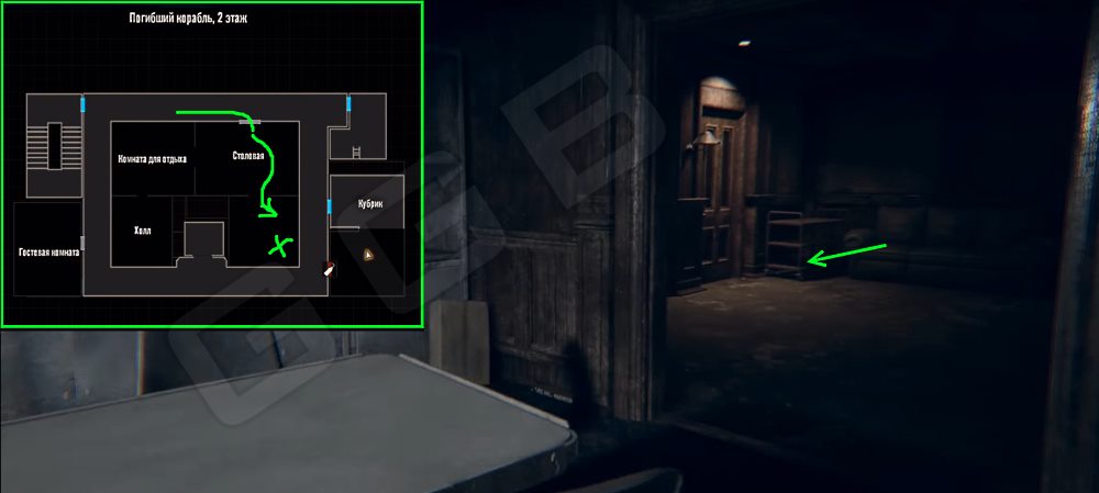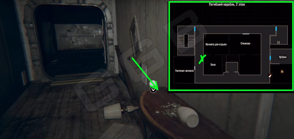 Монета 27. Погибший корабль, второй этаж. В коридоре со стороны Гостевой комнаты, у стены на столике.